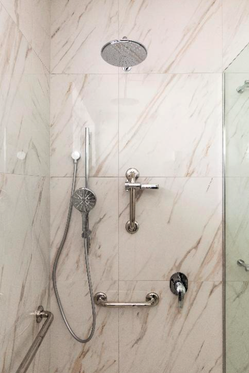 - Sturdy grab-rails in the shower for stability and mobility concerns