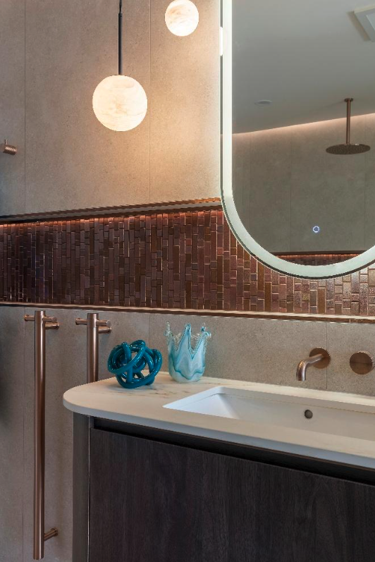• Aim to master your colour story for shower spaces and the bathroom vanity. Soft beiges, warm neutrals, creamy whites, gentle greys, or layering in some blue, orange or olive green.