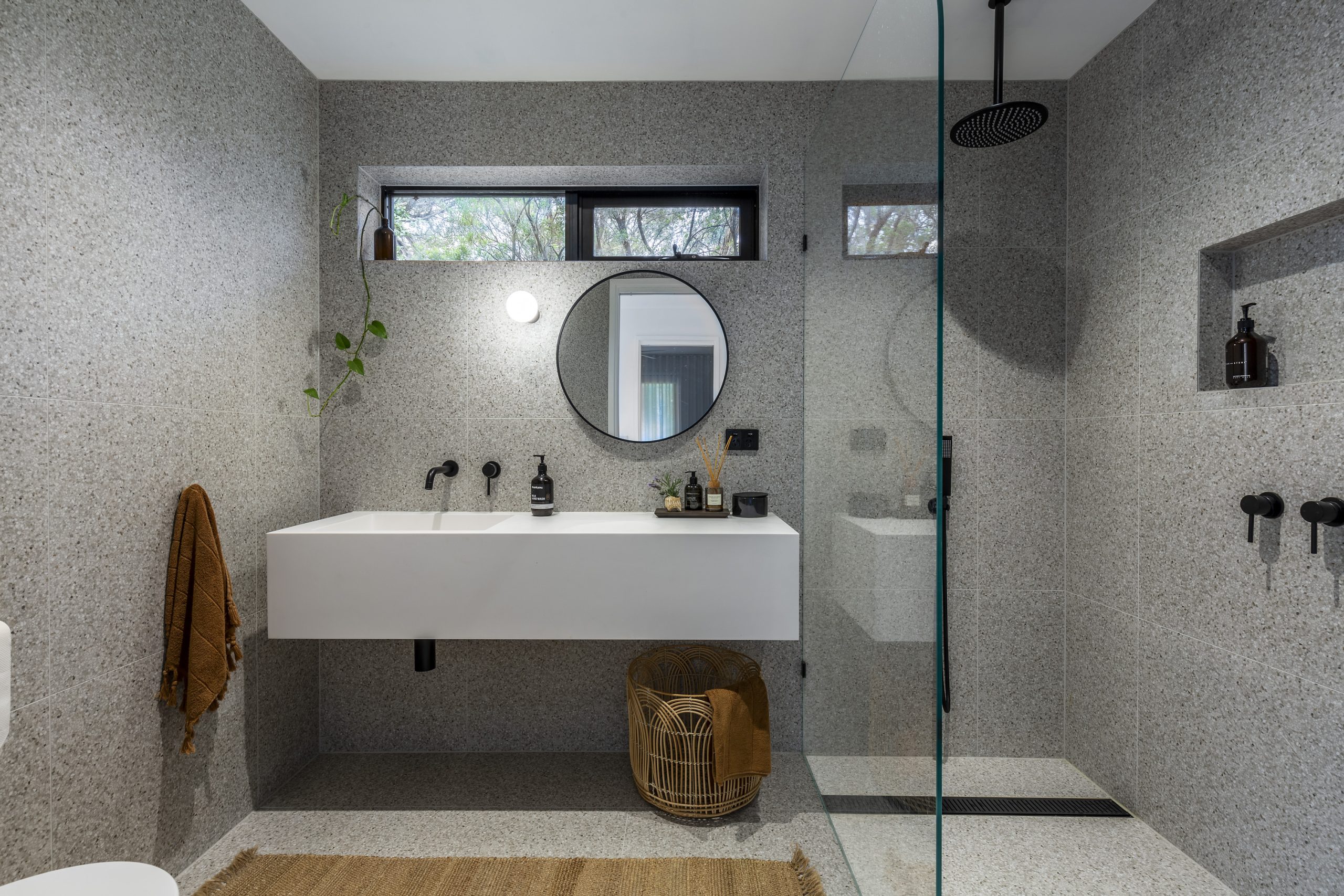 In this stunning contemporary bathroom we added three small narrow windows to help even out the distribution of natural light. We also added a floating counter with a circular mirror and an adjacent towel rack to help save on space. Plus there’s a recessed wall inside the shower for storing essential toiletries.